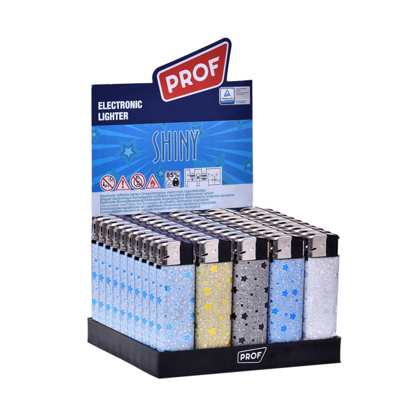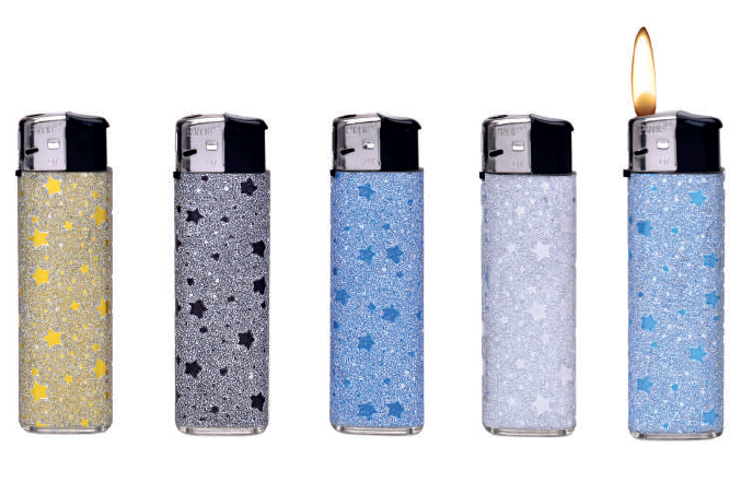 El Encendedor Prof Estrellas combina diseño y funcionalidad con un acabado brillante decorado con estrellas en distintos tonos.